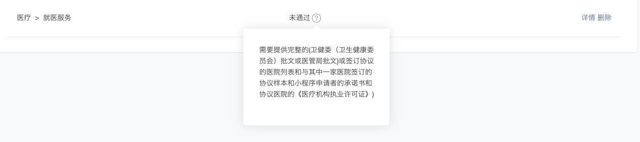你好,经核实用户提交资质存在以下问题:1) 提交的 与其中一家医院签订的协议样本:提交协议不完整无法确认,建议补充完整的协议;(注:协议内容需含”预约、挂号“等就医服务内容)2)提交的 小程序申请者的承诺书:需补充完整的合作医院列表 (建议与签订协议的医院列表一致)3)提交的 协议医院的《医疗机构执业许可证》资质为复印件,需补充小程序主体公章注意:小程序提交资质主体需与小程序注册主体一致,且用户提交小程序资质判断以小程序实际提交资质内容为准