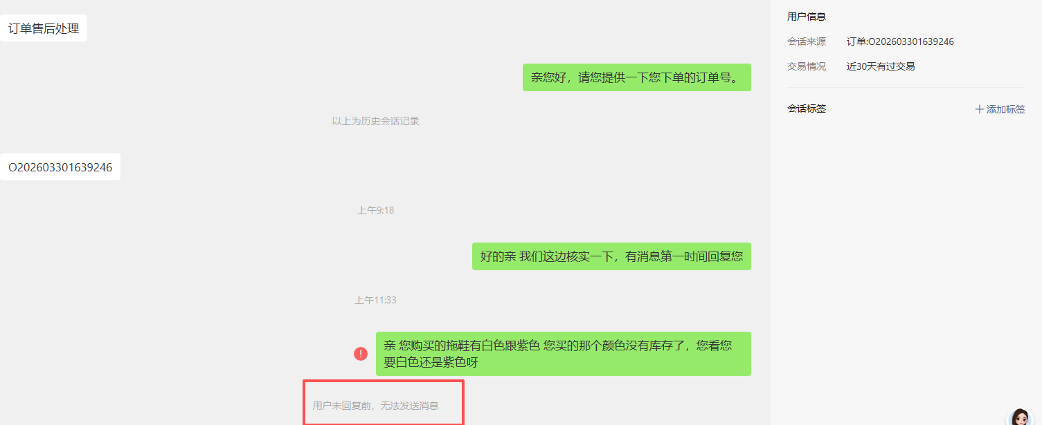 用户回复后,商家只回复了一条消息,为什么回复第二条会“提示用户未回复前,无法发送消息”