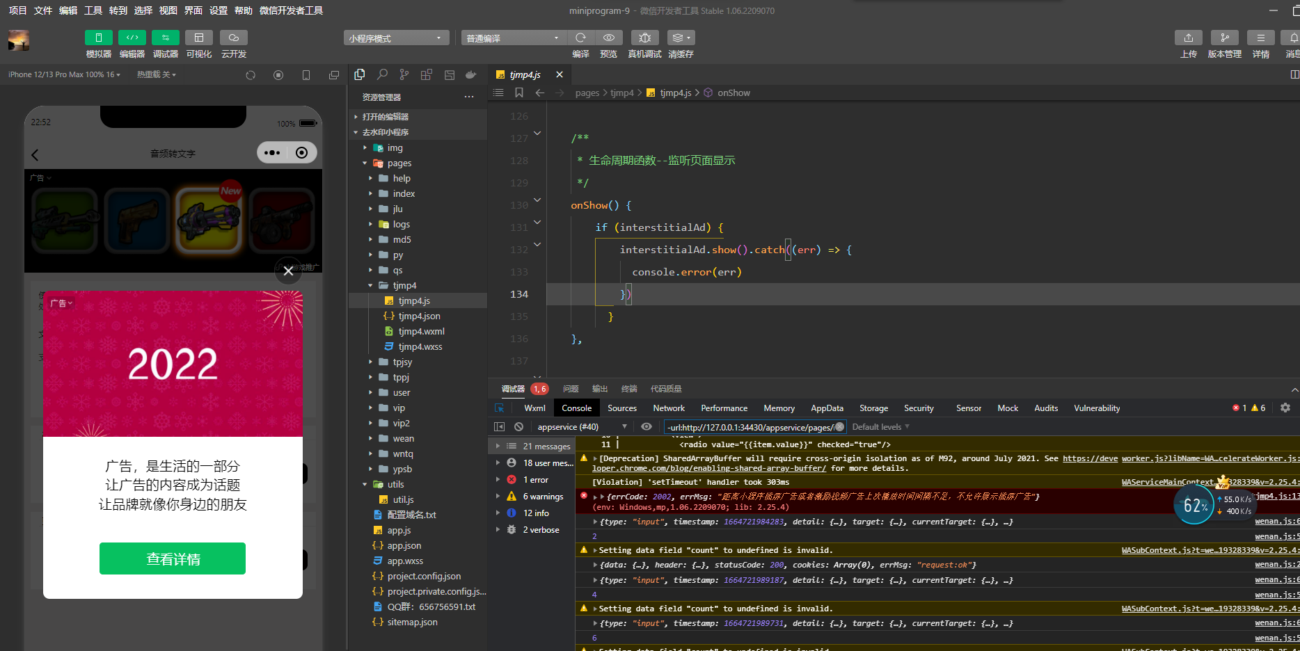 // 在页面onLoad回调事件中创建插屏广告实例if (wx.createInterstitialAd) {interstitialAd = wx.createInterstitialAd({adUnitId: 'adunit-14a93e5455706802'})interstitialAd.onLoad(() => {})interstitialAd.onError((err) => {})interstitialAd.onClose(() => {})}// 在适合的场景显示插屏广告if (interstitialAd) {interstitialAd.show().catch((err) => {console.error(err)})}