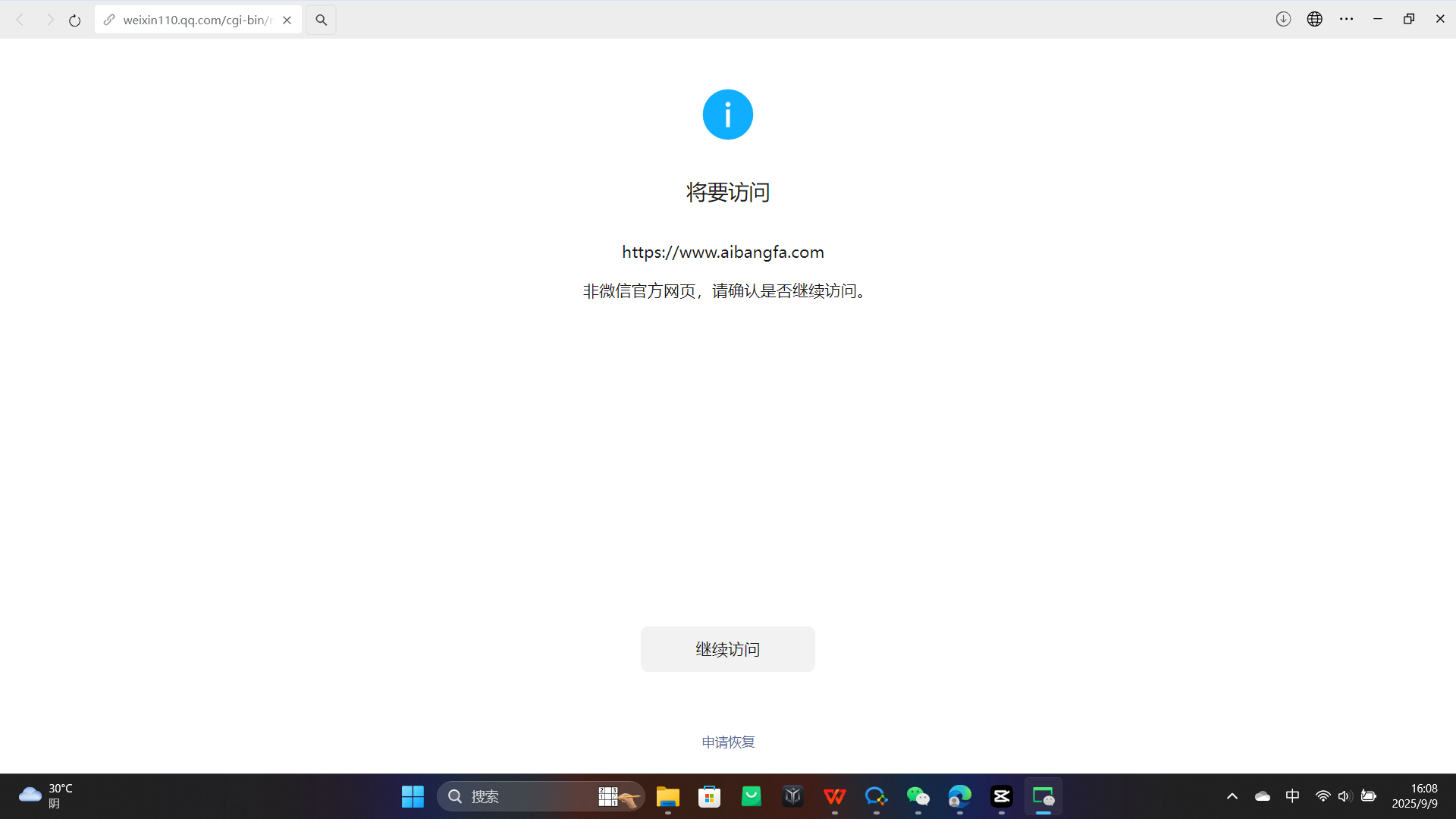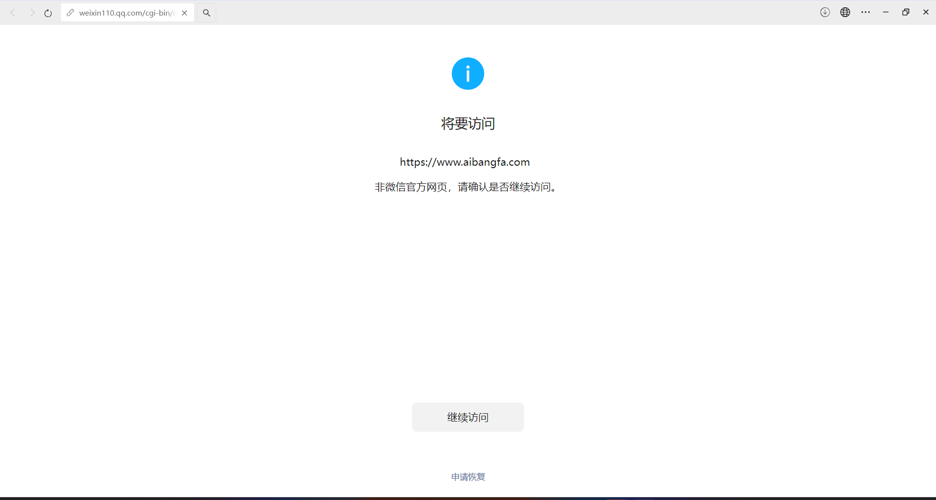 社区技术专员,您好,个人网站https://www.aibangfa.com/,在微信里访问会提示非微信官方网页,请确认是否继续访问,请问该怎么处理呢?请帮忙核查一下。