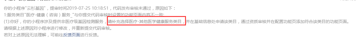 你好,经核实,贵方小程序涉及提供医疗级基因检测服务,需补充选择医疗-医疗机构类目