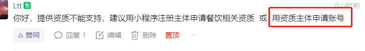 你好,提供资质不能支持,建议用小程序注册主体申请餐饮相关资质 或 用资质主体申请账号