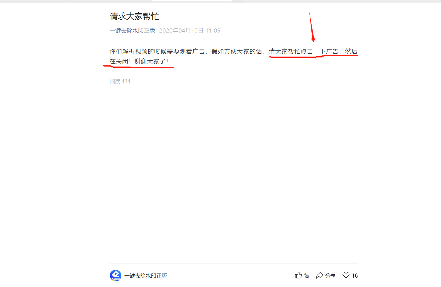 描述违规诱导粉丝点击该公众号推广的旗下侵权去水印小程序 点击广告,让用户帮忙点击广告再关闭,达到获取腾讯公司流量主分成收益,严重违规腾讯平台的规范。