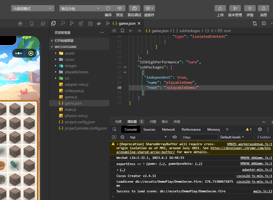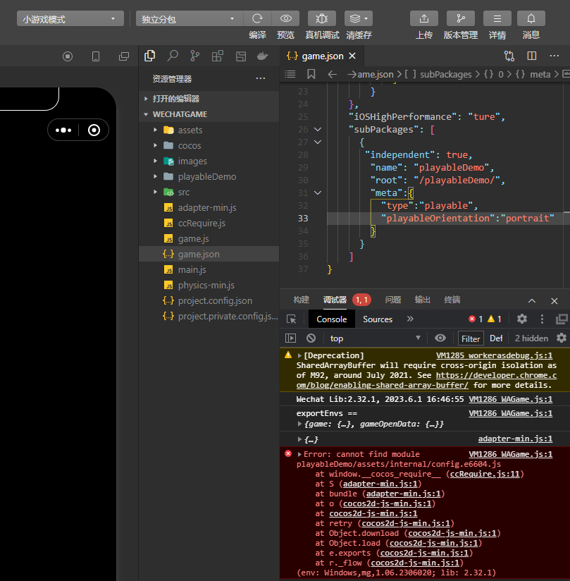 同样的问题,也使用了最新nightly版的开发工具,将这个分包做为独立微信项目打开是没问题的,放在playableDemo里面就是不行,也是cocos做的,报错日志一样,也是"cannot find module assets/internal/config.js..."。