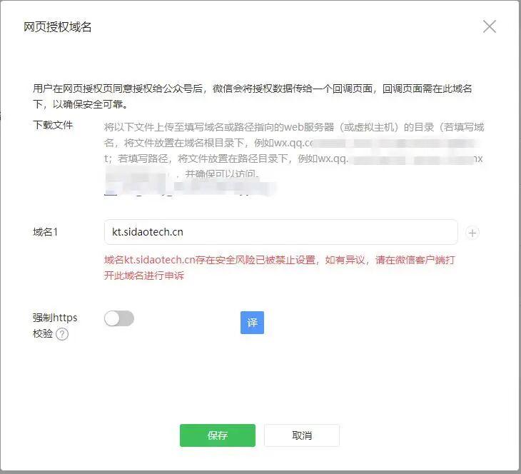 域名kt.sidaotech.cn存在安全风险已被禁止设置,如有异议,请在微信客户端打开此域名进行申诉。按照提示用微信打开此域名,选“我是站长”,回答完问题没白屏,没有下一步了,没办法申诉,就是公众号添加不了网页授权域名,域名是新购的,但愿管理员能看到此贴,帮帮我,谢谢。