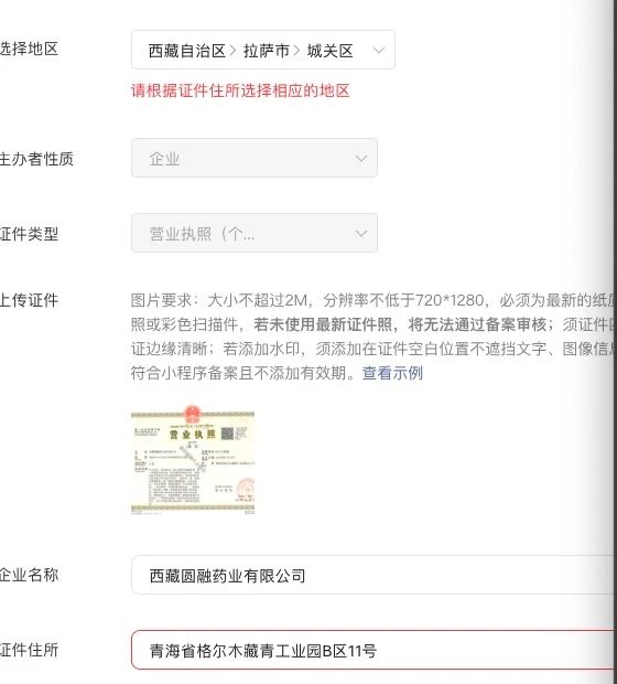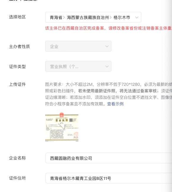 公司注册地址是在青海省藏青工业园区,但是藏青工业园区是属于西藏管辖,所以公司主体备案是在西藏。在备案小程序时提示以下信息,麻烦你们技术人员处理下,看下怎么解决?