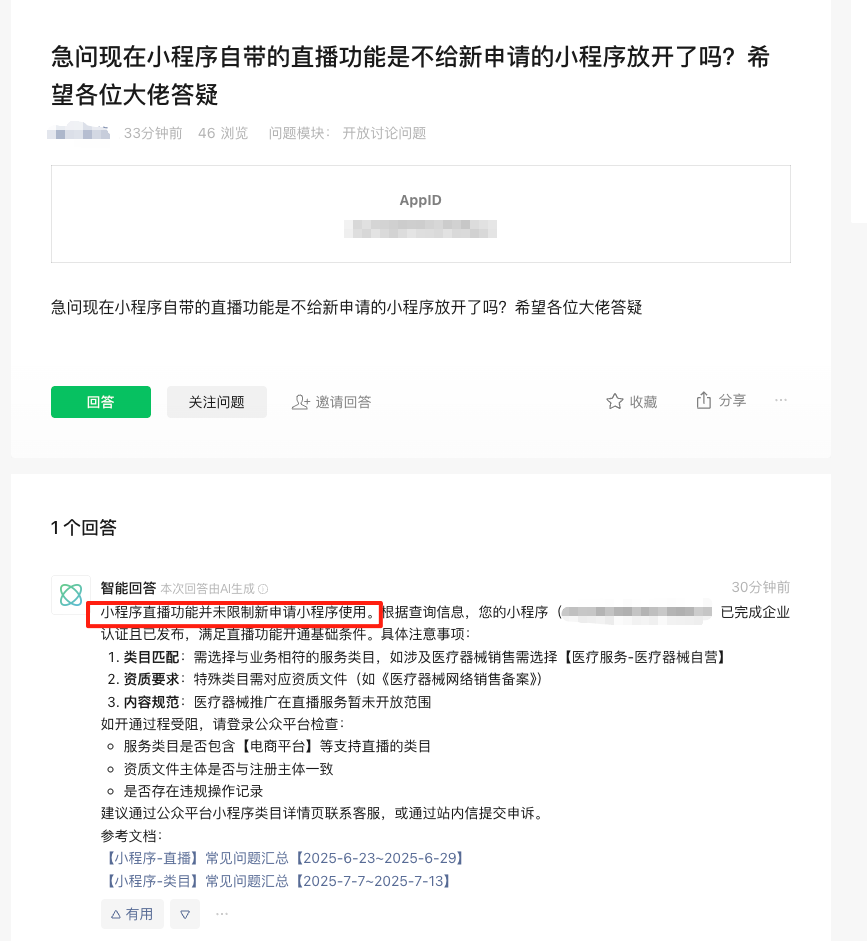 4、目前已经暂停新开通小程序直播的权限了,智能回答的知识库欠缺。