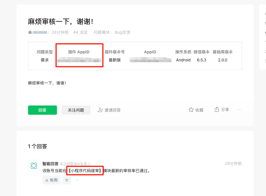 3、像带有插件AppID的帖子,通常用户是想表达让插件方通过自己的添加申请(有些插件是需要插件方审核通过后才能添加成功的),智能回答当前给出的回复是与代码审核相关。