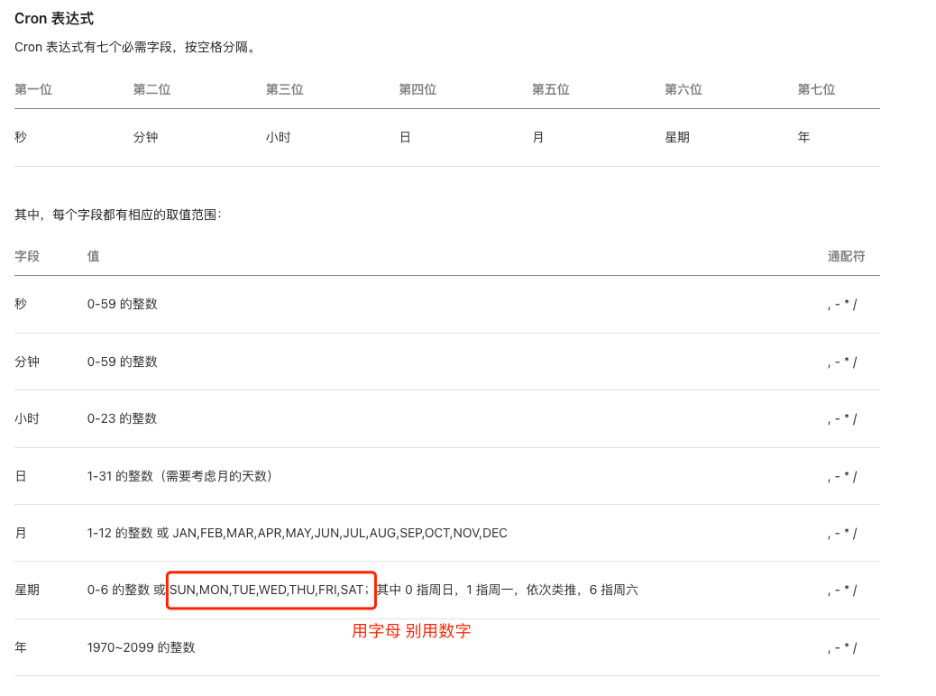 换个写法就没问题,根据你的需求改成 0 0 0 * * MON * 就行了
