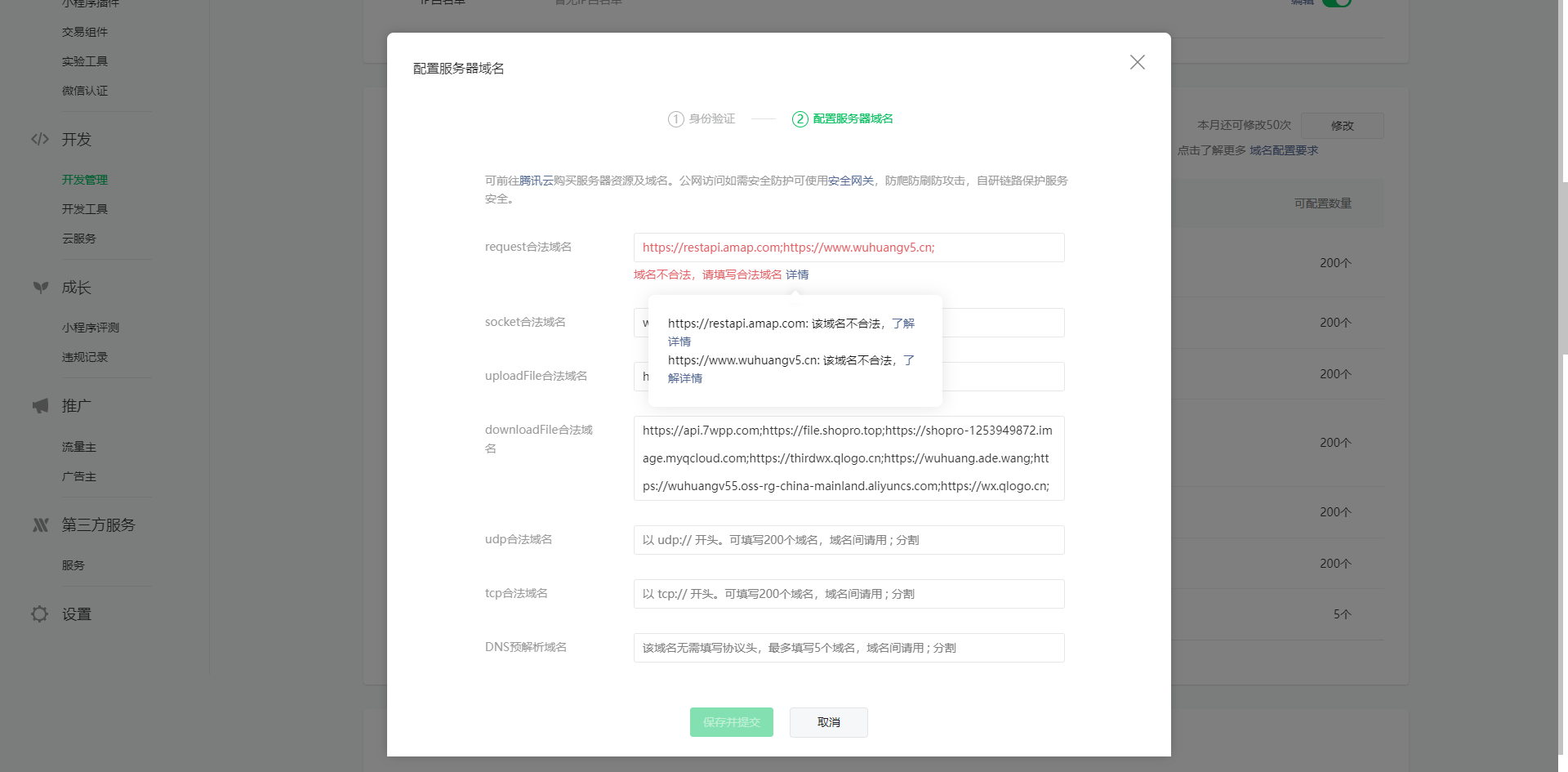 之前配置的域名跟新添加的域名都提示域名不合法,我也找不到相关文档如何解决这个问题,也没有提示我不合法在什么地方,该如何去解决。希望这个问题能有效解决,感谢