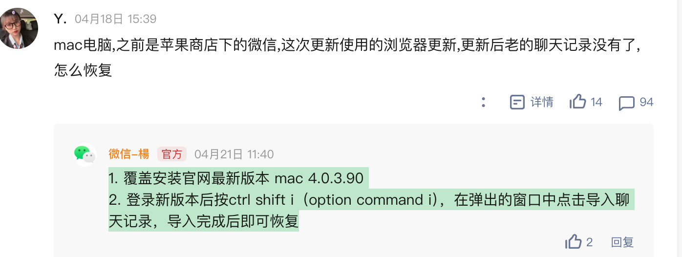 2. 登录新版本后按ctrl shift i(option command i),在弹出的窗口中点击导入聊天记录,导入完成后即可恢复
