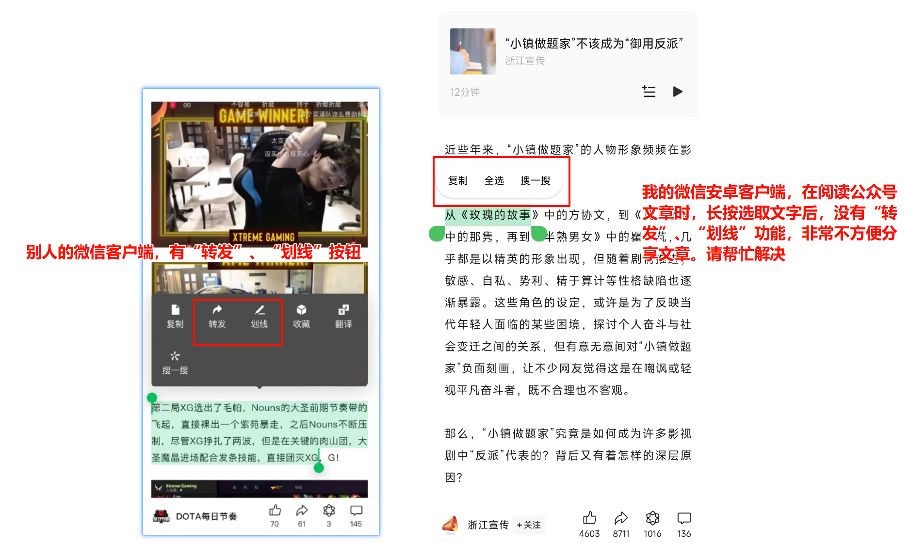如图所示,本人手机和平板登录微信,打开公众号文章,长按选取文字后,没有划线分享按钮,卸载微信客户端重装,换手机都没有用,在网上看到很多人貌似有类似的问题,求解如何开启此功能?