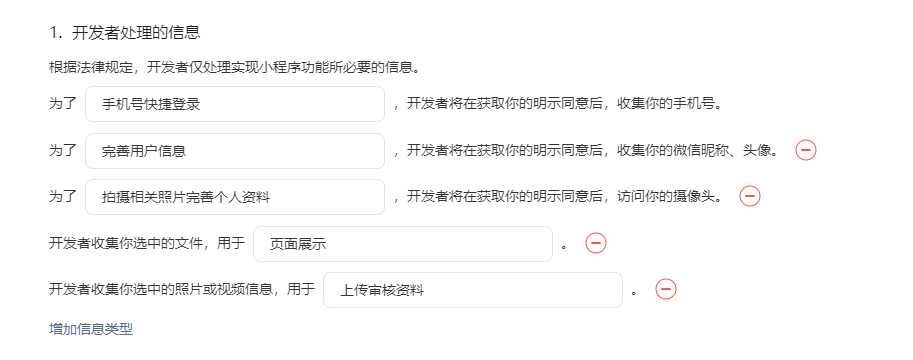 你好,建议在入口2(管理—版本管理—提交代码审核—信息填写页面—用户隐私保护指引设置)修改,提交版本审核,并发布生效。