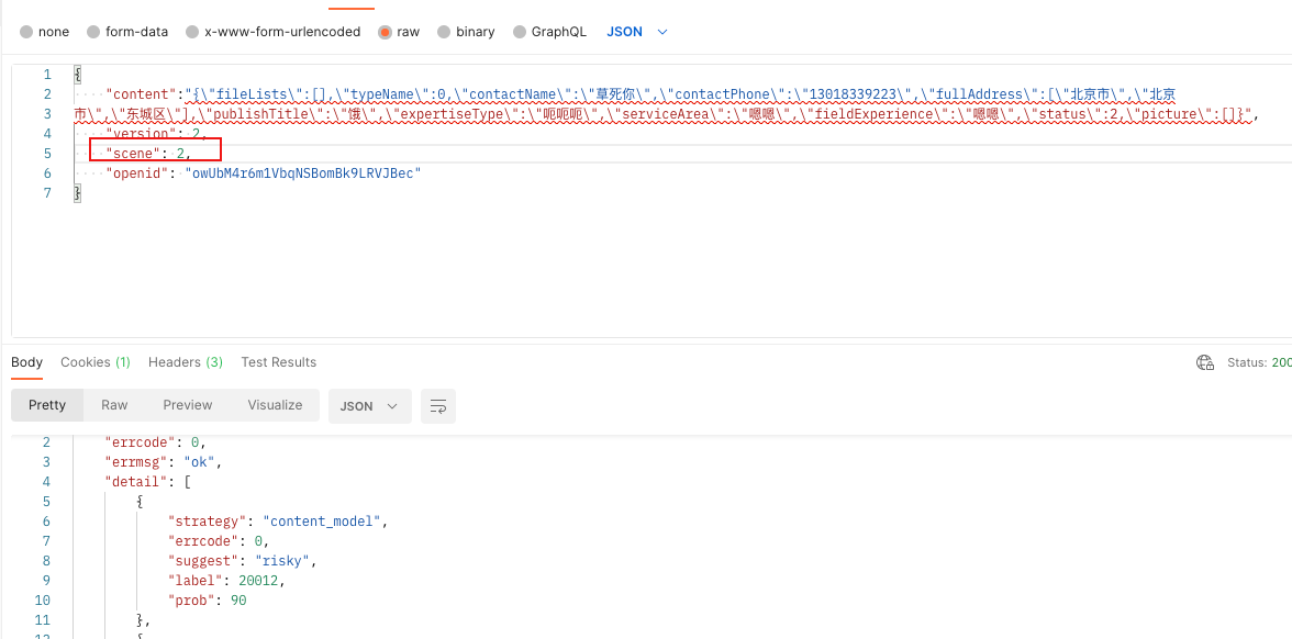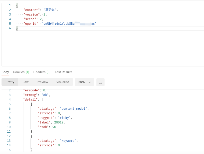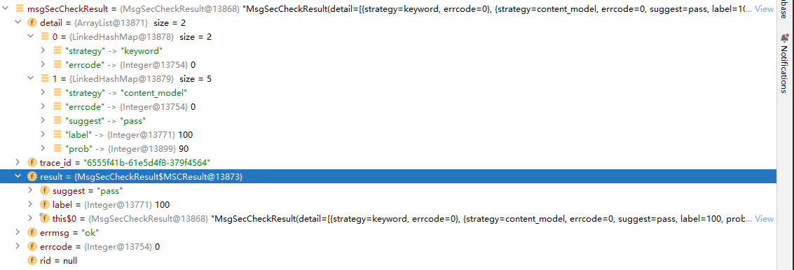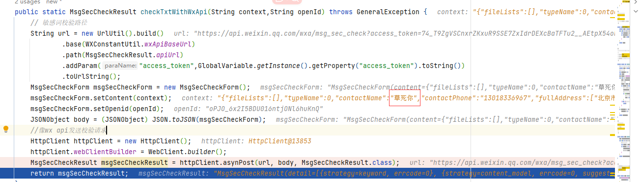 下图为debug图,可以看见我输入的词里包含了敏感词