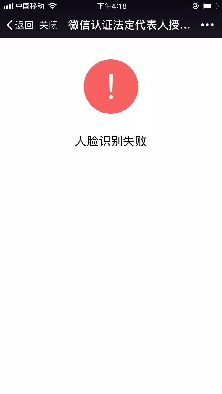在微信做认证提交的过程中,在这个地方提交法定代表人验证,然后手机上出现实名授权,需要人脸识别,但是没有出现人脸识别的操作,直接判定人脸识别失败。无法提交微信认证,无从下手去咨询,各位大佬帮帮忙