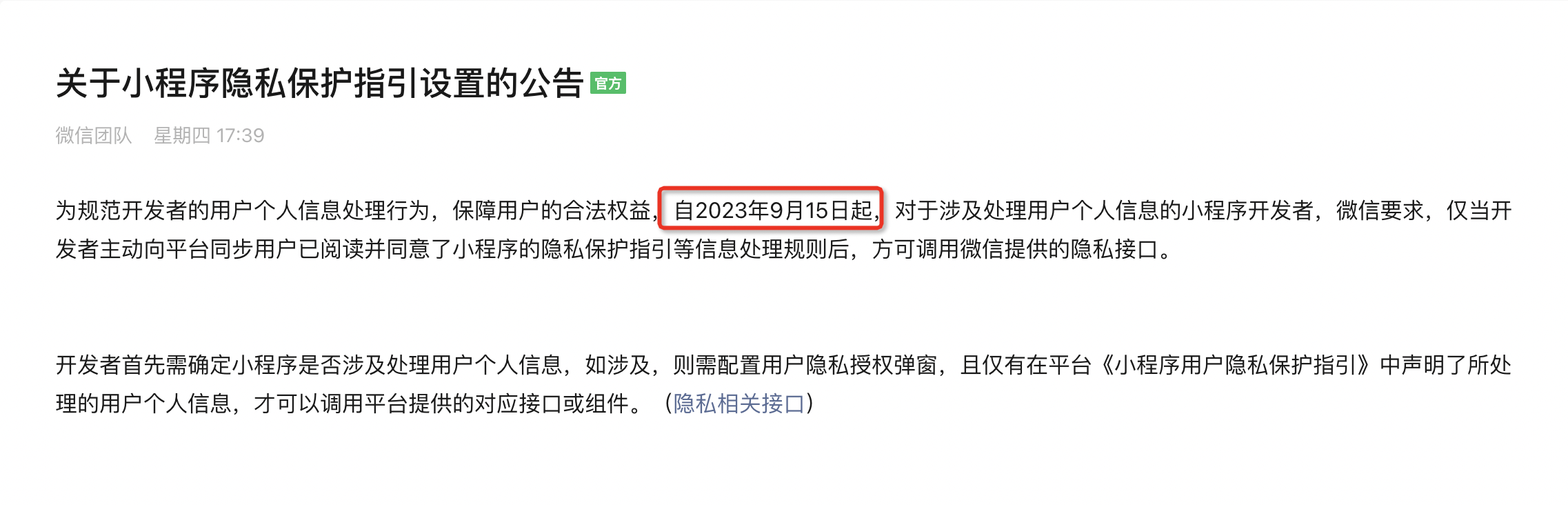 2023年9月15日之前,此功能逻辑只对开发版/体验版生效,开发者请尽快进行隐私弹窗适配、发版。2023年9月15日之后,将对正式版生效,详情可见《关于小程序隐私保护指引设置的公告》。