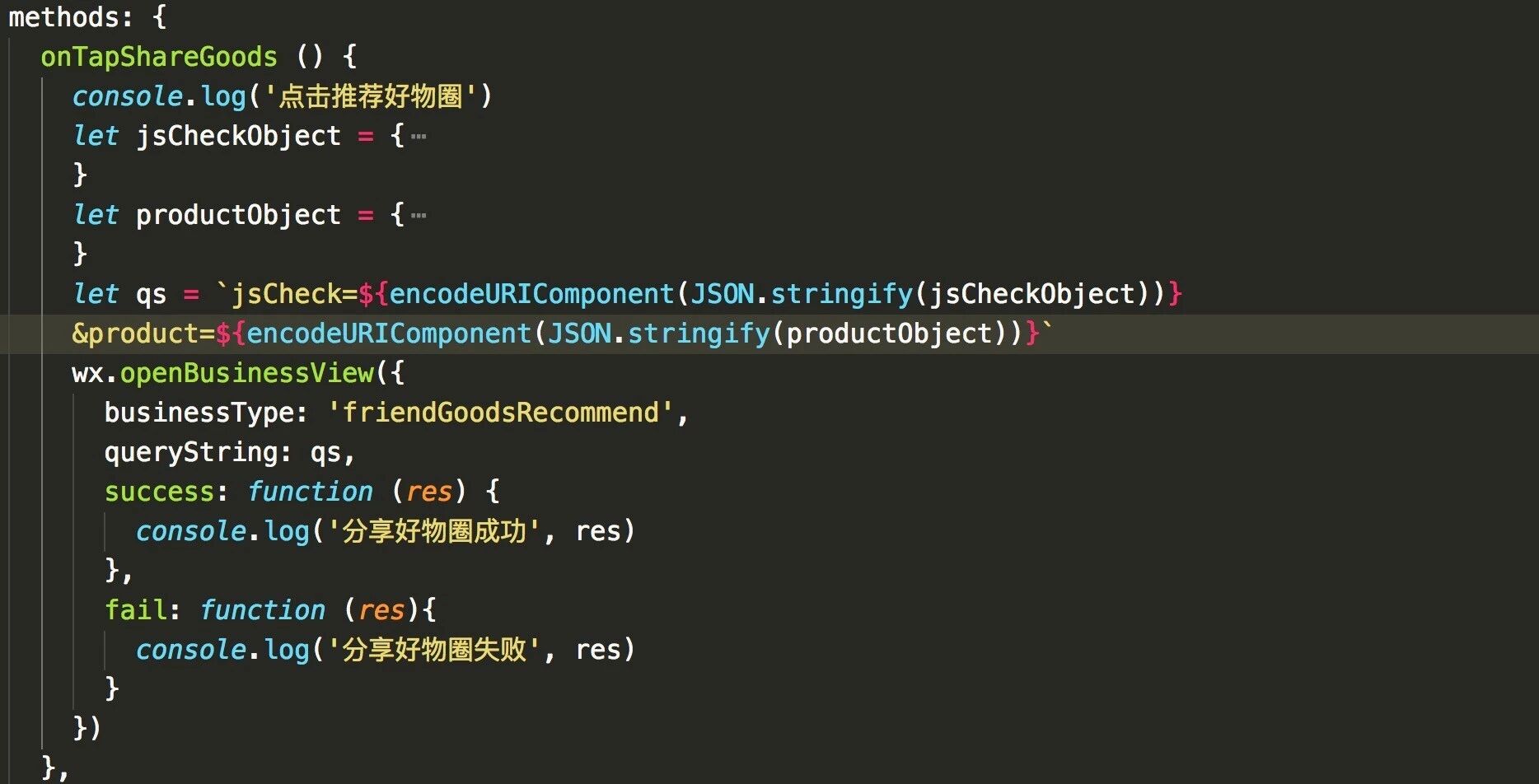 我是把那一段赋值给了一个变量,然后再用. 点击分享到好物圈按钮,调用这个api,然后就会报错, ios报 cgi error ; android 报 permission denied。