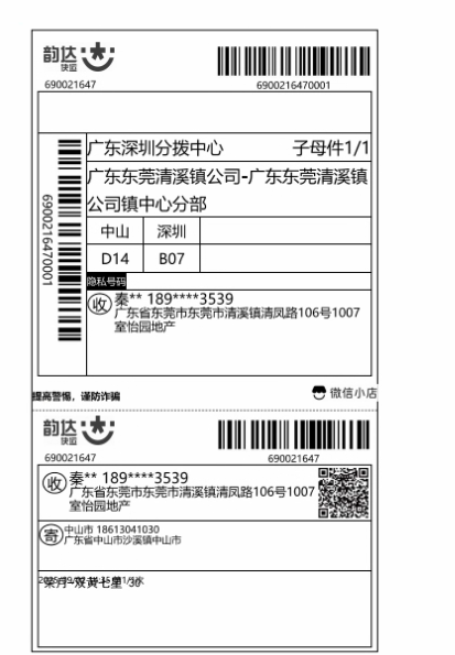 请求数据:{"delivery_id":"YDKY","delivery_info":null,"ec_order_list":[{"ec_order_id":3730601248747299584,"goods_list":[{"good_count":30,"good_name":"荣月-双黄七星","out_product_id":"RYQXBY10HE","product_id":10000293928177,"sku_id":4145995519,"sn_info":null}]}],"ewaybill_acct_id":"6637501700","ewaybill_order_id":"4147355567886712837","ext_info":null,"order_type":1,"receiver":{"address":"~广东省 东莞市 ****~/shipinghaoxiaodian/~1~~","city":"东莞市","county":"东莞市","mobile":"~189****3539~/shipinghaoxiaodian/~1~~","name":"~秦**~/shipinghaoxiaodian/~1~~","province":"广东省","street":""},"remark":"","return_address":{"address":"","city":"","county":"","mobile":"","name":"","province":"","street":""},"sender":{"address":"中山市","city":"中山市","county":"沙溪镇","mobile":"18613041030","name":"中山市","province":"广东省","street":""},"shop_id":"5009833816449","site_code":"56753337","template_id":"6637081993"}