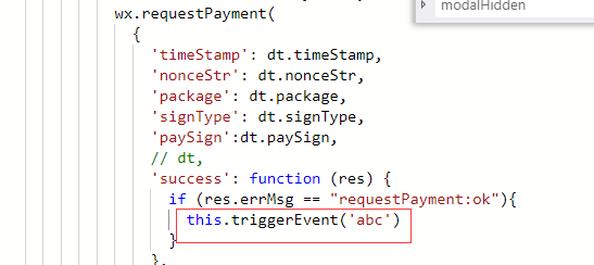 此为 组件内的 支付方法, 成功后 给父组件传递一个方法,使页面data改变。 为啥报错用这个