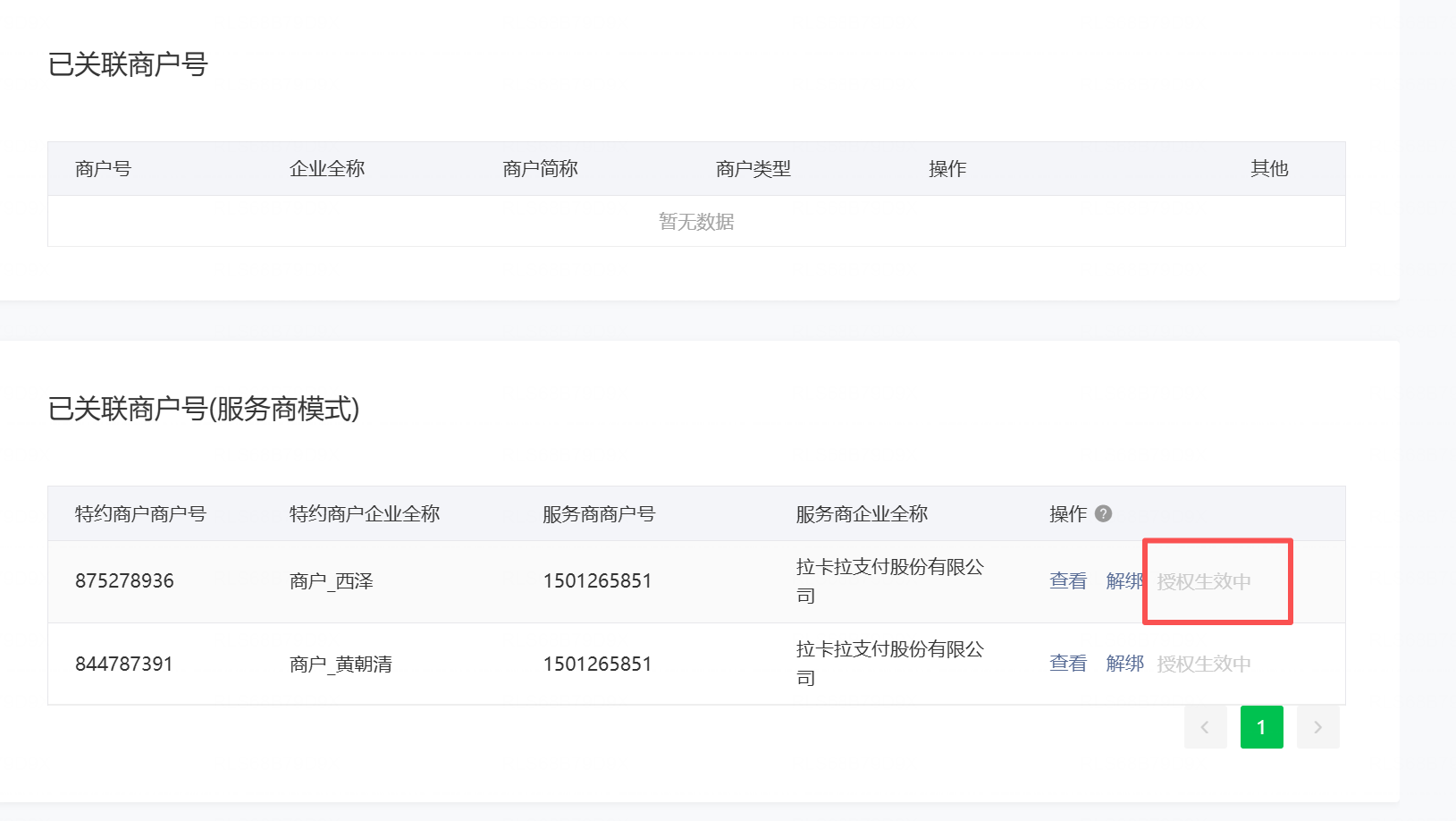 路径:请登录小程序管理后台(https://mp.weixin.qq.com/)-「支付与交易-微信支付-商户号管理-已关联商户号」和「支付与交易-微信支付-商户号管理-已关联商户号(服务商模式)」进行操作,具体的授权流程可查看以下文档:https://mp.weixin.qq.com/cgi-bin/announce?action=getannouncement&key=11676444126btWNY&version=1&lang=zh_CN&platform=2