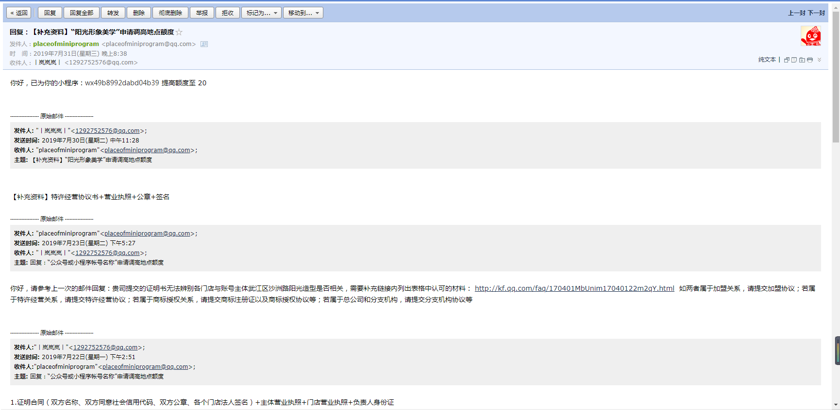 你好,为了方便贵司日后的额度提升,建议后续附上特许经营许可协议的首尾页提交审核;首尾页的内容需要包含双方名称、双方的统一社会信用代码、双方公章;如果被授权方无法提供公章,请提供被授权方法人的签字盖指纹以及被授权方法人的身份证材料代替公章。