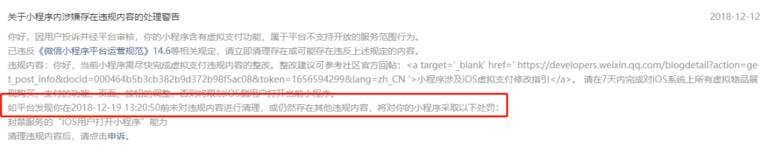具体问题情形描述:我们误解了虚拟支付规则,这周更新版本引导了ios用户去个人号转账支付,昨天下午13点左右被提示整改,要求7日内整改完毕,我们更改了还没来得及发布,昨晚大概20点左右就把我们ios端封禁了,被打了个措手不及,用户大面积受影响,昨晚紧急提交了版本还在审核中,也提交了申诉,现在还没有恢复。