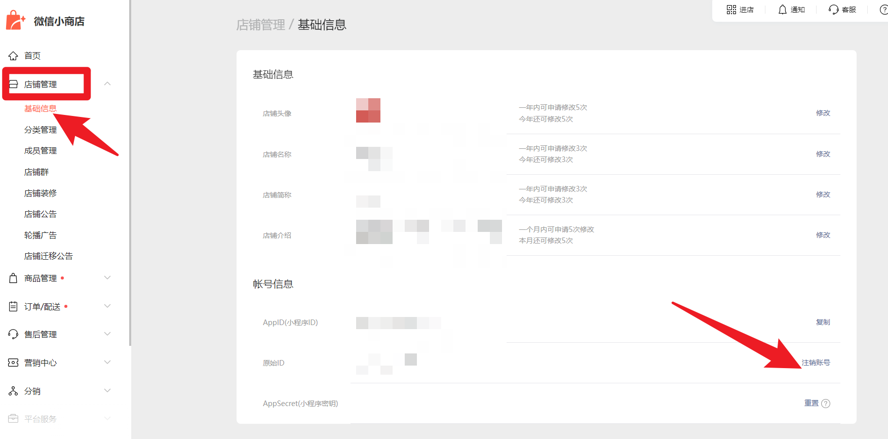 登陆电脑端浏览器网页后台https://shop.weixin.qq.com/ 店铺管理-基础信息-注销