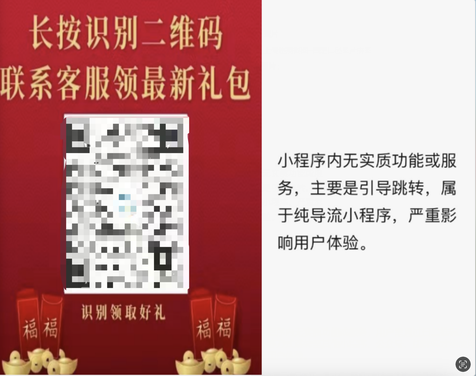 别人使用一个导流二维码举报说我的小程序是没有实质性功能或者服务,主要是引导跳转,也能够成功。而且还永久封禁我的小程序。 已经提交了申诉,但是没有反馈。