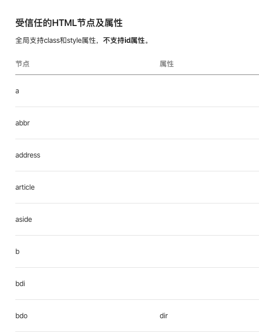 为什么会有“受信任的HTML节点及属性”这样一个名单?是基于什么决定的支持哪些元素和属性的呢?很想知道,谢谢~ ・ω・