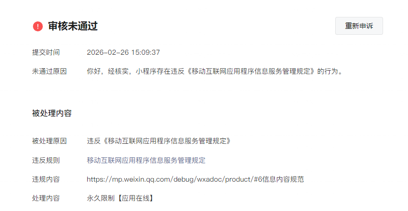 1.收到小程序违规下架通知后,我们进行根据提醒进行自查自纠,发送申诉后,审核未通过。