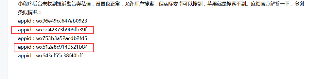 小程序后台未收到投诉警告类私信,设置也正常,允许用户搜索,但实际安卓可以搜到,苹果就是搜索不到。麻烦官方解答一下,多谢