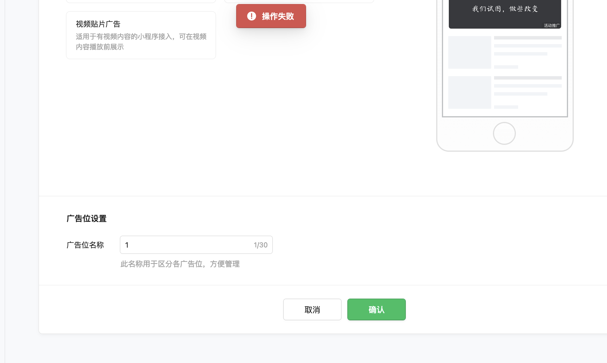 客服你好,我的小程序广告位创建的时候一直提示失败,请问应该怎么弄?急,请回复!谢谢
