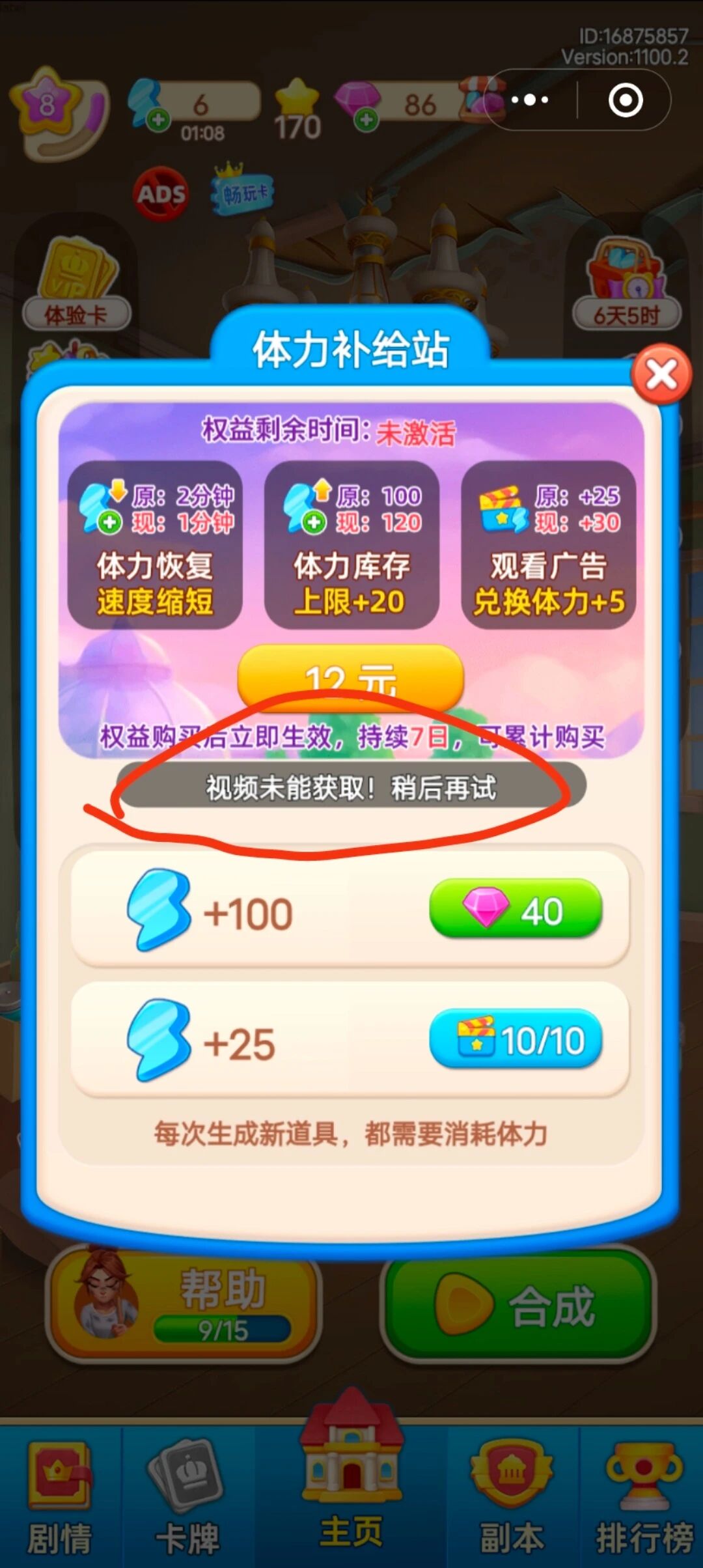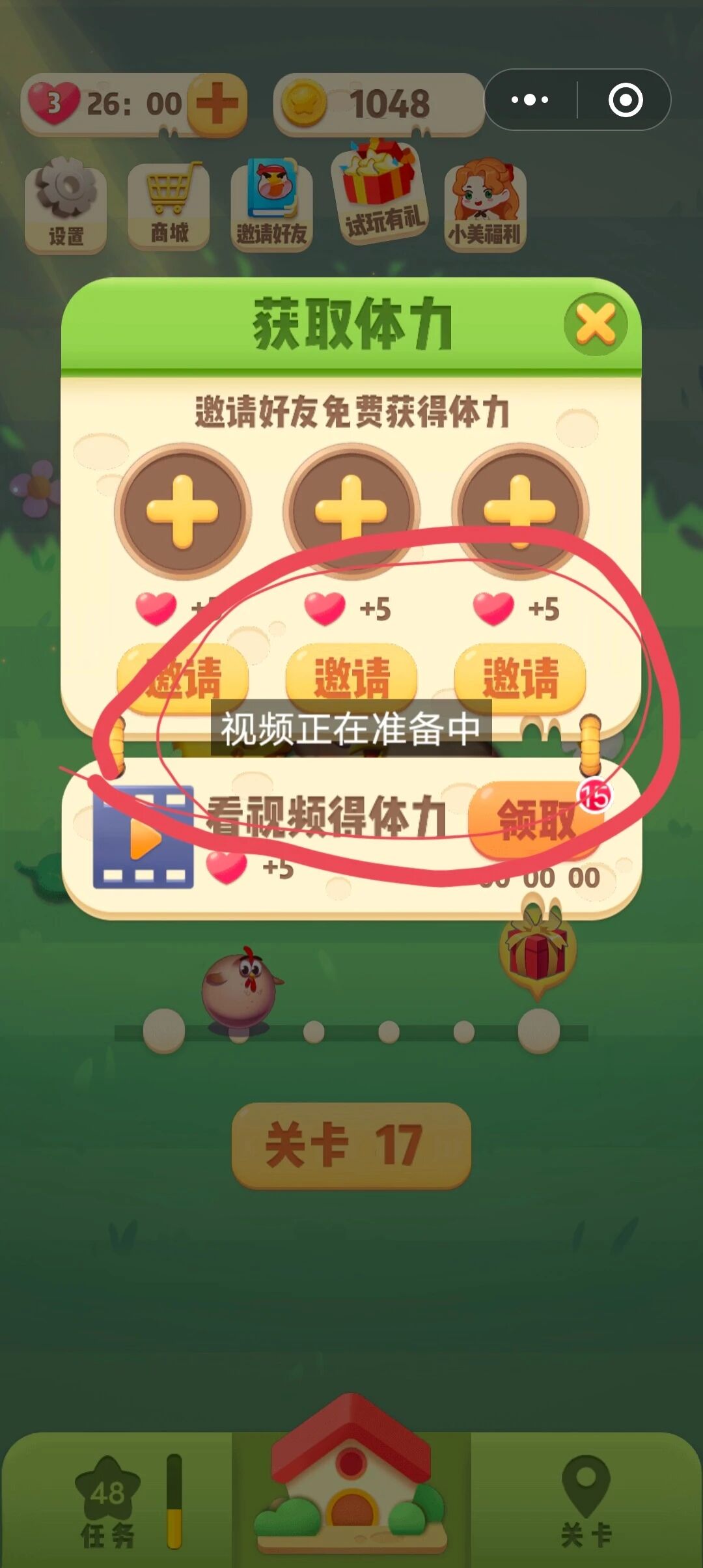 微信小程序里,玩游戏时有需要看视频加体力,确看不了视频
