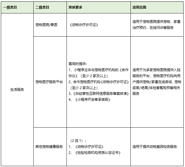 代码审核环节,将会对小程序内所经营服务的内容与所选类目是否相符进行核实,当小程序服务内容为提供宠物/家禽的预约治疗、问诊咨询、多家宠物医院提供入驻服务的平台以及动物基因检测等服务,则需要选择对应的动物医疗服务类目进行合规运营,如【生活服务-宠物医院/兽医】、【生活服务-宠物医疗服务平台】类目或【生活服务-其他宠物健康服务】类目。