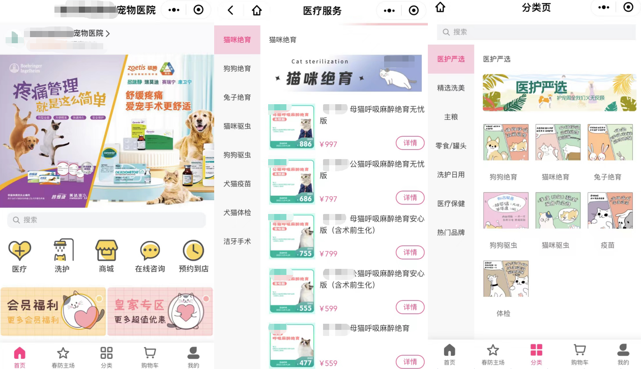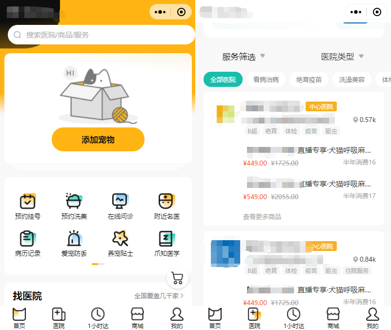 2、自查代码,移除多家宠物医院提供入驻服务的平台,宠物医疗机构向用户提供宠物/家禽在线咨询、宠物疫苗/绝育/体检套餐购买等相关内容及分类标签。
