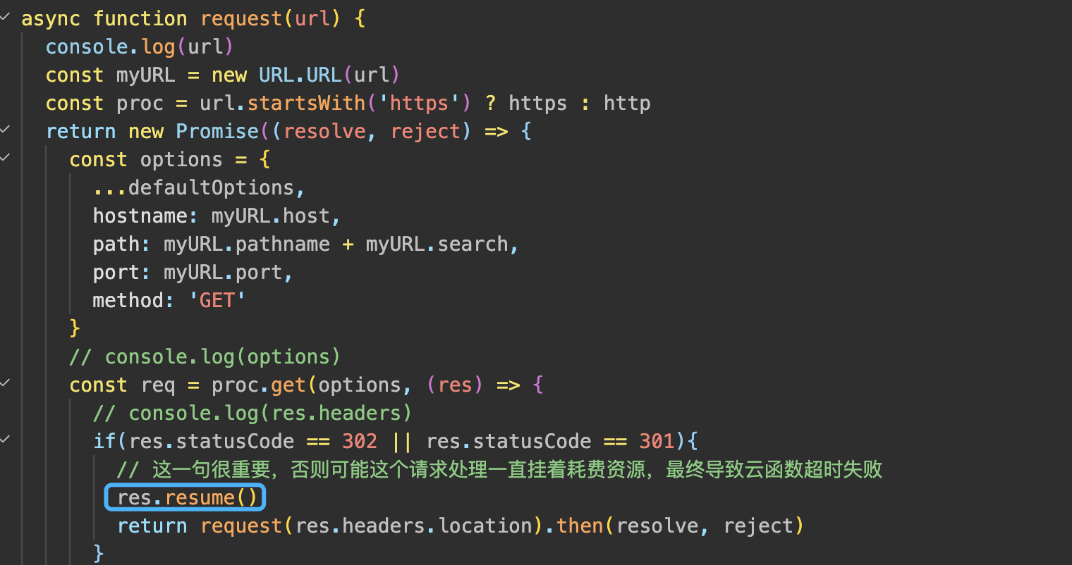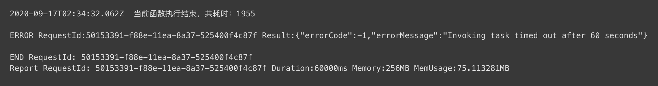 如上图第一行日志是我在云函数结束时打印的计时结果(单位:ms),为何系统打印时间是60s,并且超时失败了,请问一下,main函数执行到最后一行还在做什么工作吗?我的函数中是异步请求了外部网络,但是都是用的await转同步了的,请技术同学帮忙看一下。