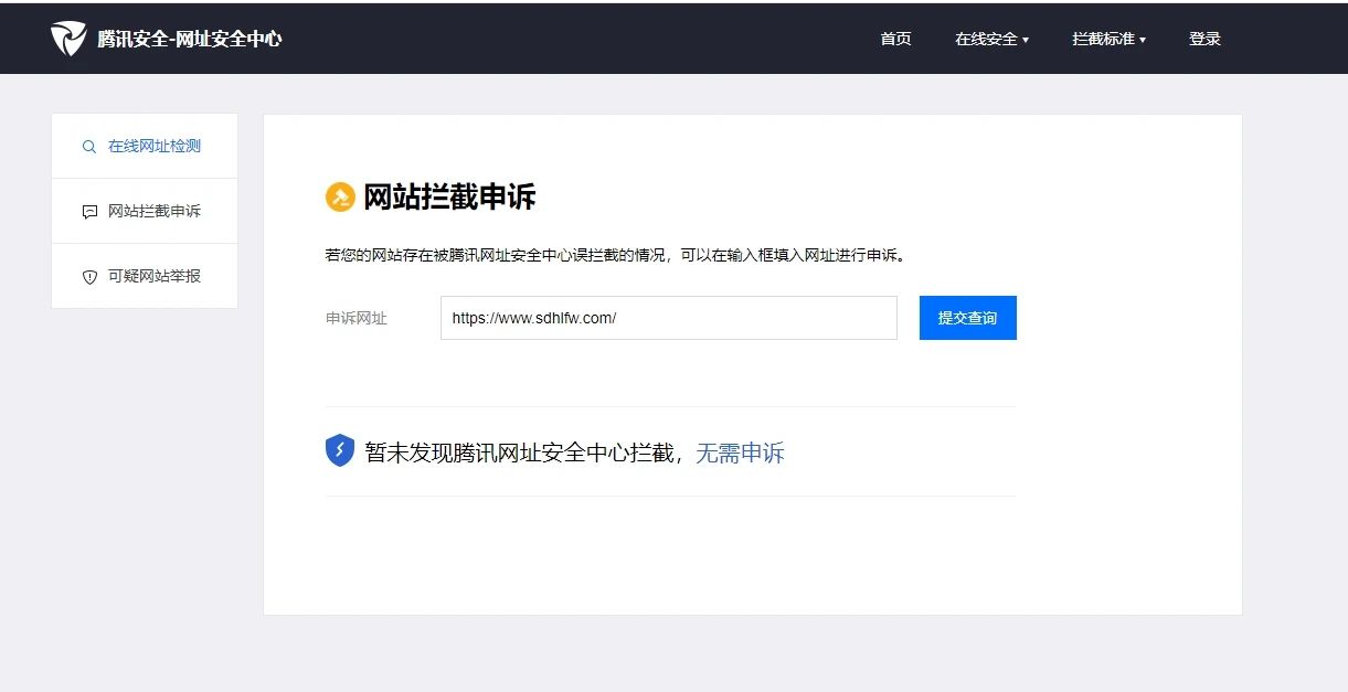 尊敬的审核员,我们公司网站https://www.sdhlfw.com/#/ 通过腾讯安全检测未发现异常,希望贵公司能帮我们网站域名解决拦截,项目急着上线,在此诚恳感谢.