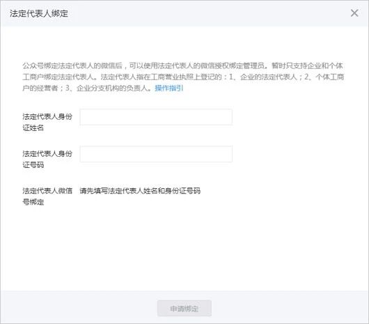 请登录公众平台,点击账号设置->法定代表人,点击绑定进入绑定法定代表人信息页面。