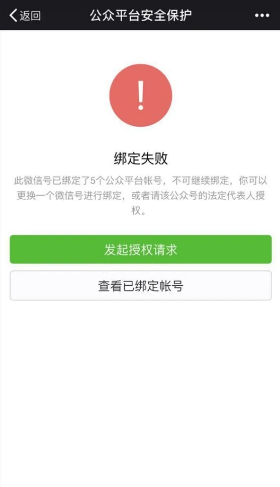 如果管理员绑定的公众号/服务号达到了50个的话,不能再绑定新的账号。