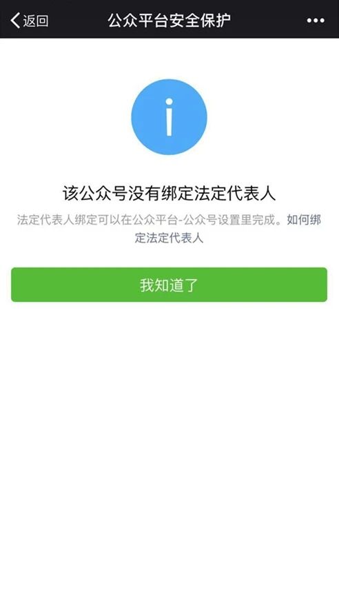 第二步:如账号没有绑定法定代表人,请先登录公众平台,点击账号设置->法定代表人,绑定即可,如下图提示: