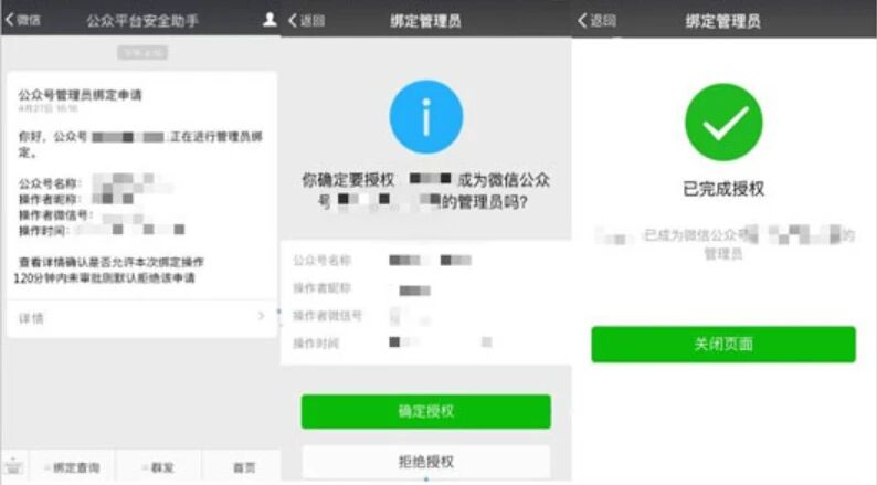 第三步:如账号已经设置了法定代表人信息,发送请求给法定代表人之后,法定代表人微信号“公众平台安全助手”会收到一条申请通知,法定代表人需要在120分钟内确定授权,确定授权或拒绝授权,超时则默认拒绝授权。