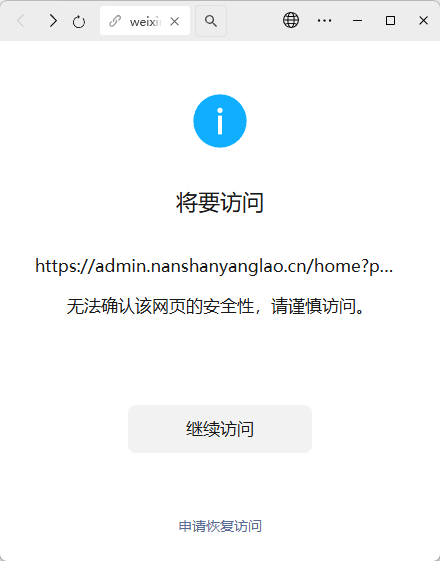 但是现在打开时碰到【无法确认该网页的安全性,请谨慎访问。】,导致哪怕点击继续访问也无法访问到小程序