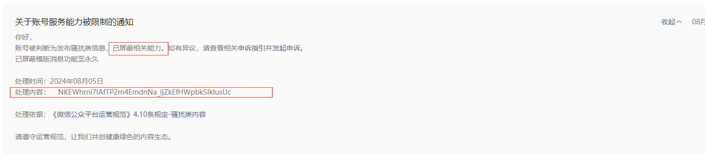 你好,并不是封禁该条模板消息,是封禁的模板能力。请自行联系站内信客服申诉。若能力存在违规第三方代开发公众号获取token都会报错