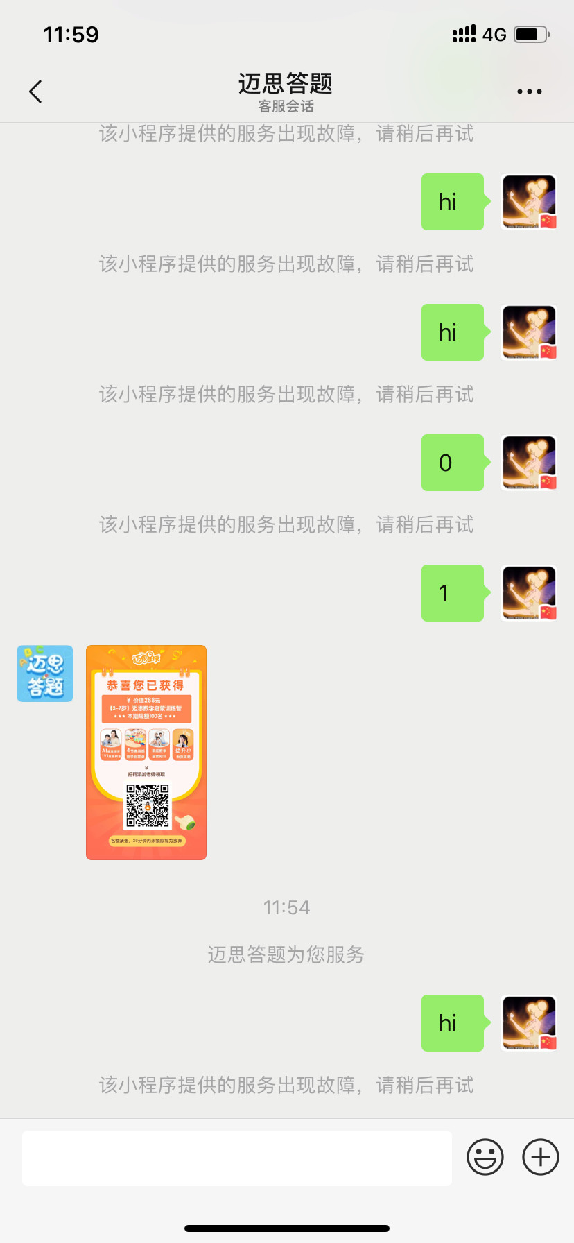 小程序用户发送“1“有正常的自动回复,但是发送其他任何文字都显示“该小程序提供的服务出现异常,请稍后再试”