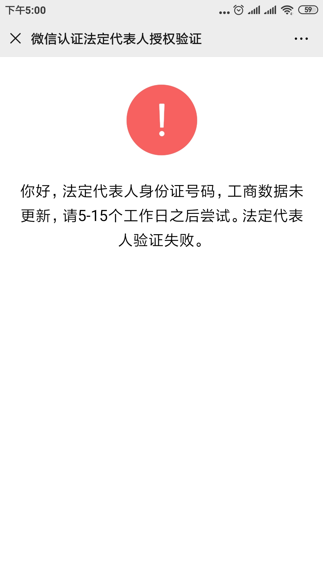 公众号是注册不久的,没有微信认证,提示:你好,法定代表人身份证号码,工商数据未更新,请5-15个工作日之后尝试。法定代表人验证失败。请刷新重试