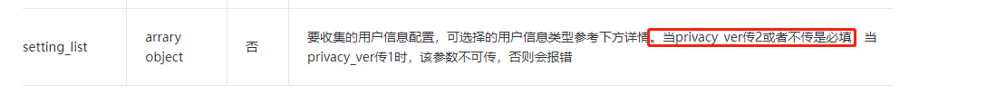 谢谢反馈,我们优化一下哈。的确是【privacy ver 传2或者不传的时候,setting_list是必填,privacy ver传1时,setting_list不能传】