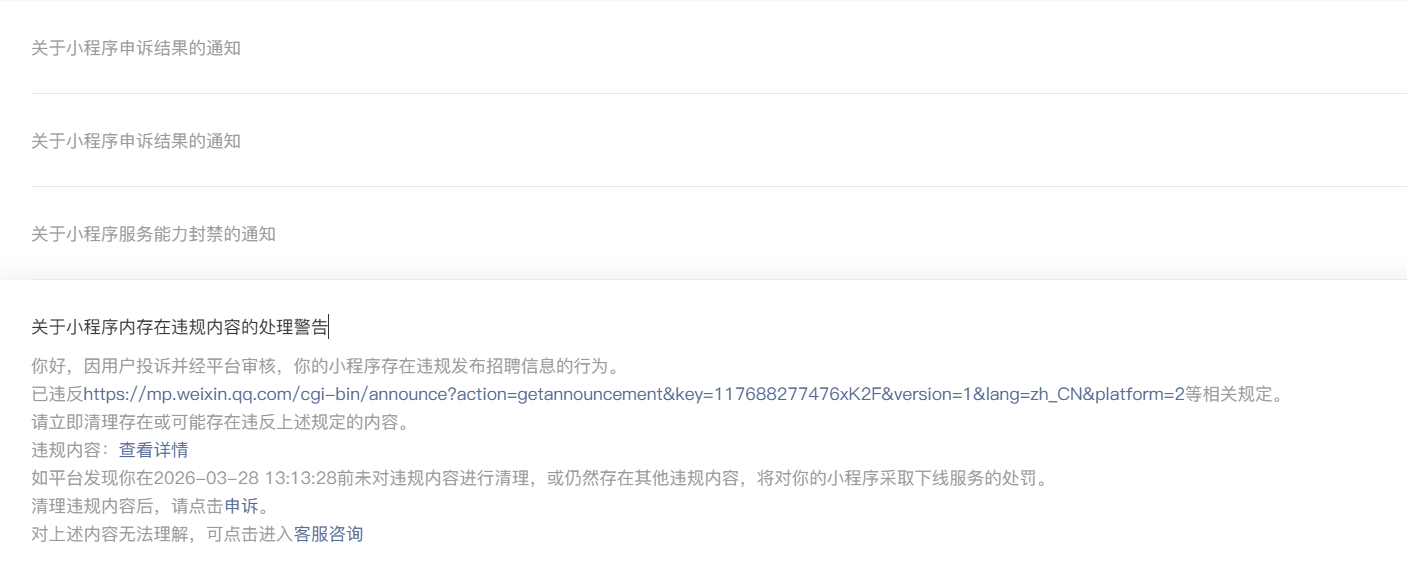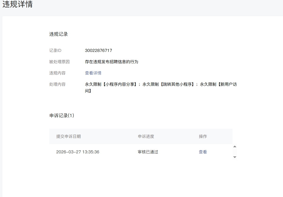 小程序为招聘类型小程序,因内部审核职位时疏忽,部分职位没有按要求填写工作内容,被限制分享,跳转小程序功能。按要求整改后提出申述,申述通过后任不能分享是为什么
