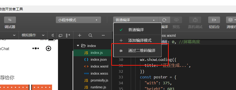 生成小程序码后可在客户端开发工具中,通过二维码编译进行测试scene参数