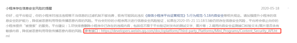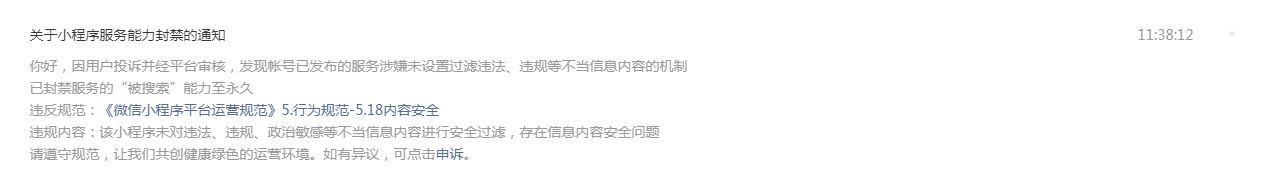 官方你好,我们已经添加官方所给的内容安全接口并结合自己的过滤机制,但是还是被封了搜索,想问一下具体哪方面存在问题还需要整改