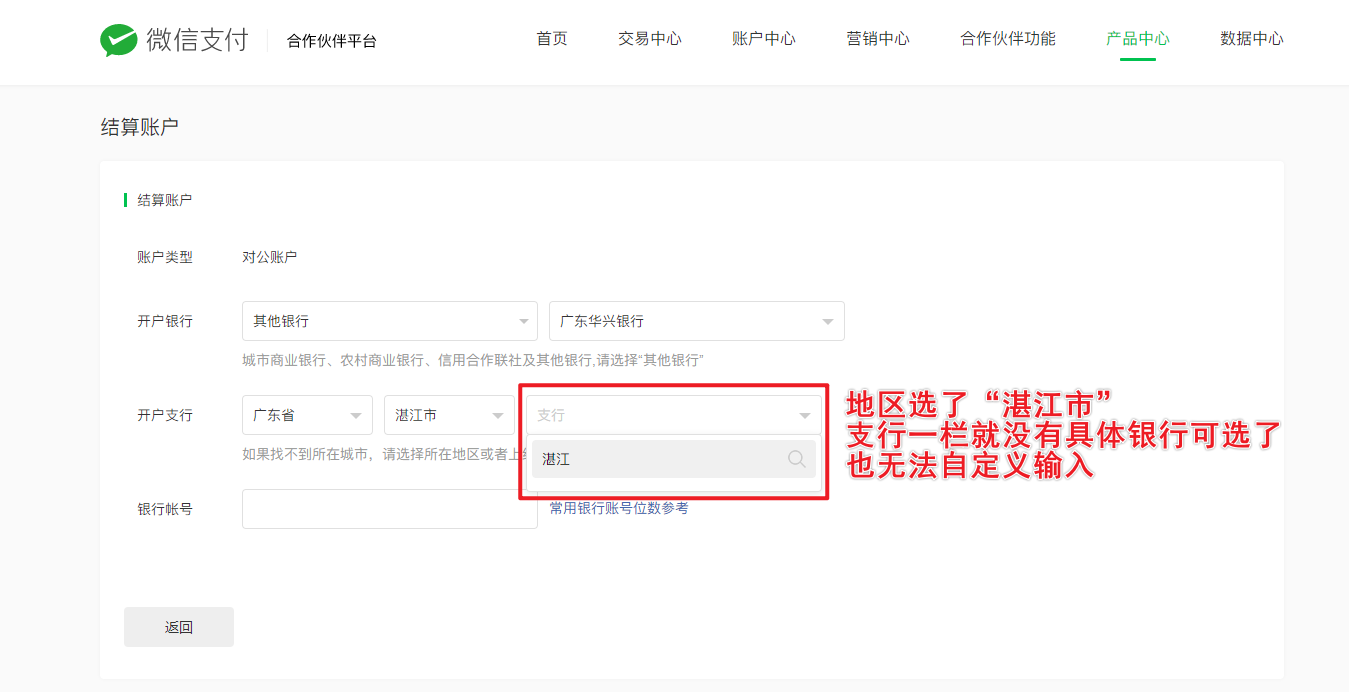 如题,微信支付商家-结算银行账户-开户支行无法选择【广东华兴银行湛江分行】